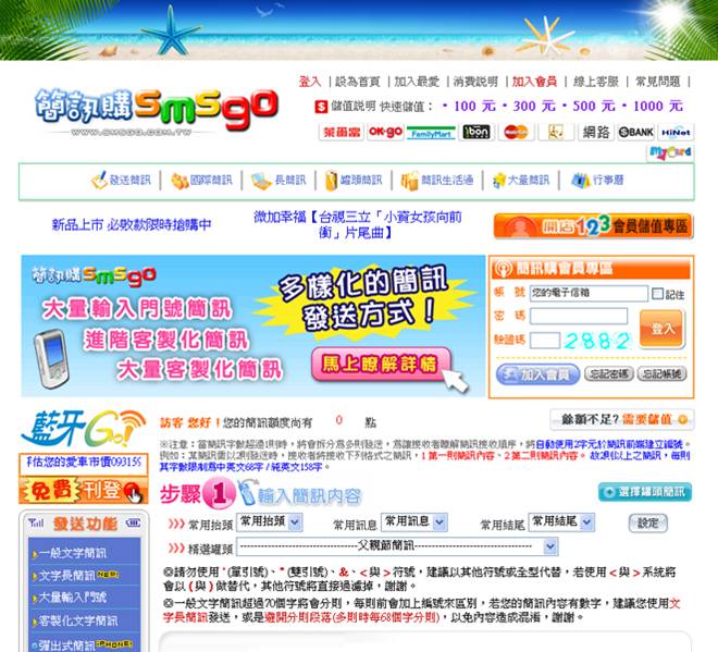 簡訊購SMSGO結合各項專業技術,提供價格優惠、操作便利的簡訊發送平台,供會員一般簡訊發送(大量簡訊發送、國際簡訊、客製化簡訊、生日預約發送、文字長簡訊、彈出式簡訊)、發送記錄查詢(查詢發送、空號、回補、儲值等記錄)、資料管理 (子帳號管理、通訊錄管理、API企業簡訊串接、群組發送、行事曆、罐頭簡訊、常用訊息設定) 等功能服務。簡訊購具有客製化服務,可以針對特定的族群設計不同的簡訊內容,透過簡訊的傳送,做到即時、大量、成本最低廉、目標最精準、效益最直接的廣告行銷,「有效率」的對目標族群傳遞簡訊促銷廣告訊息、節慶活動通知、會員通知管理,不分網內網外失敗不計費,簡訊購提供線上刷卡、ATM轉帳、超商代碼繳費、銀行臨櫃繳款,線上交易,立即開通使用,線上發國內簡訊最低價0.98/則!快!快!快加入會員,享受大量簡訊輕鬆發送的恣意快感。